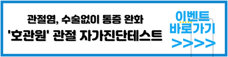 퇴행성 관절염의 자가진단법은 여러 가지가 있습니다. 예를 들면, 차렷 자세로 선 후 무릎과 무릎 사이에 주먹을 대보고 주먹 하나 이상으로 벌어지면 퇴행성 관절염이 의심됩니다. 또한, 양반다리를 하고 10초 동안 앉아 있으면서 무릎이 아프다면 퇴행성 관절염일 가능성이 높습니다. 좀더 자세한 자가 진단법이 궁금하신 분들은 지금 호관원에서 관절 자가진단테스트 이벤트가 진행 중이니 바로 확인하시기 바랍니다.